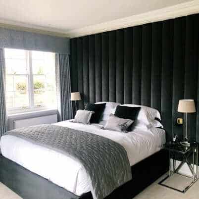 We offer a unique service allowing you to design stylish bedroom wall panelling to your chosen colours, materials and specifications. (Used as a wall-mounted padded headboard for a bed or as an elegant backdrop), the upholstered padded wall panels are designed and upholstered to suit the character and colour scheme of your bedroom.
